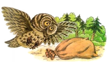 Бу арада янындан балабан мияв къуш учип кете экен. О ердеки чувалны коре, онынъ ичинде бир шей бар олгъаныны анълай ве кузюгинен чувалны ерден котерип ювасына алып кетире.