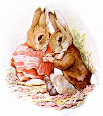 Тербиели тавшанчыкълар Флопси, Мопси ве Памукълы Къуйручыкъ ёлакъ боюна тюшип, андан бюрюльген (ежевика) джыймагъа башладылар. Сёз динлемеген ярамаз Питер исе, догърудан-догъру Макгрегор мырзанынъ багъчасына чапты. О, азбар къапыгъа етип кельди де, сюйрекленип онынъ тюбюнден кечти ве барып багъчагъа кирди.